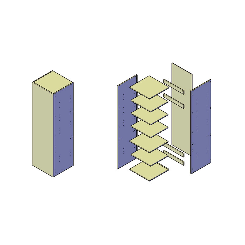 ☞Virtuvės su viendurėmis aukštomis spintelėmis naudojamos 16 mm E1 klasės medžio drožlių plokštės;