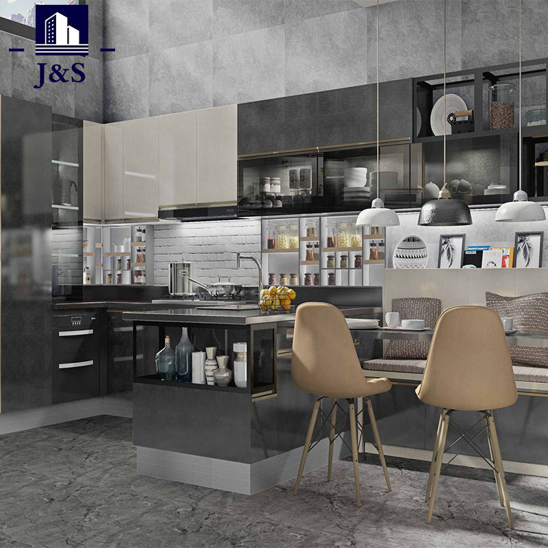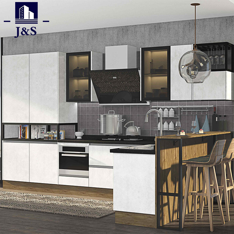 J&S tiekimas Promotion Prabangios kaimo virtuvės dizaino geriausios kainos. PET betono spalvos virtuvės durys, Nerūdijančio plieno patvarus stalviršis.