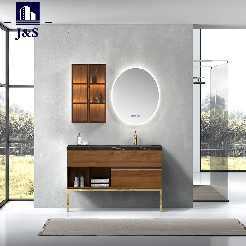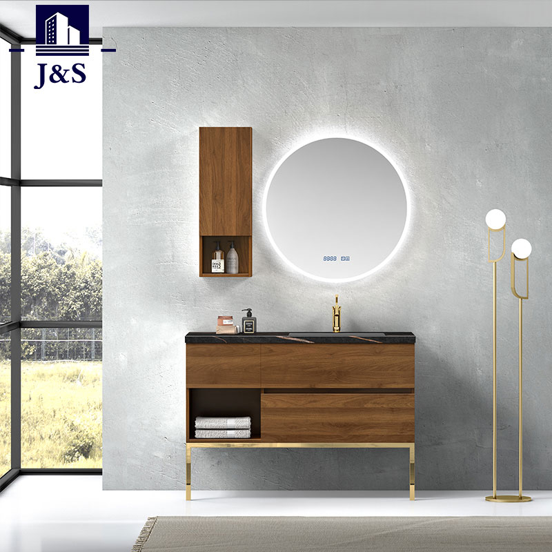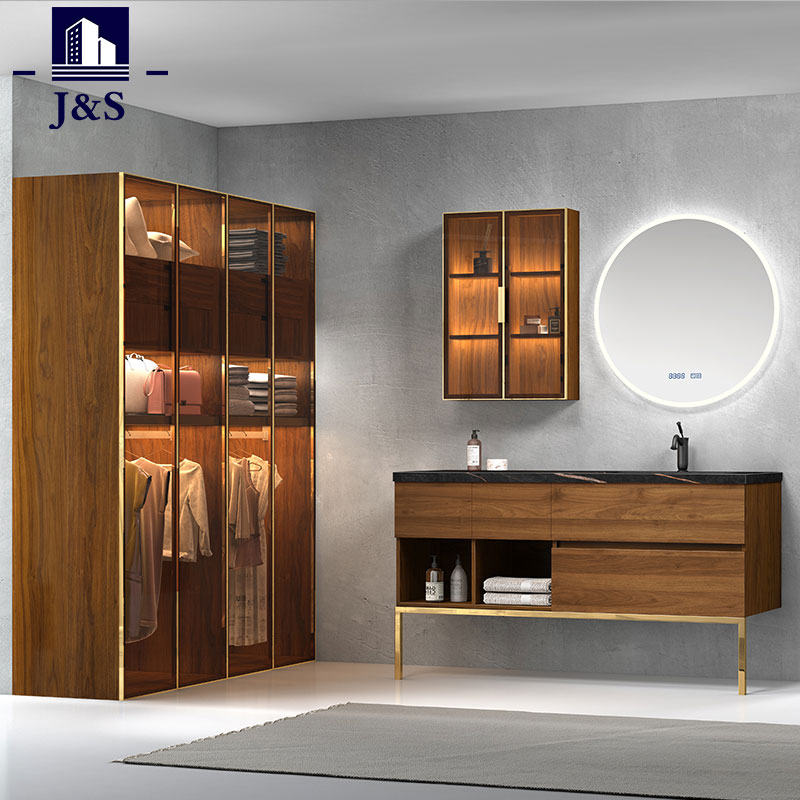 Maži mediniai vonios baldų komplektai Spintelė Praustuvas, Auksinis aliuminis spintelės atrama, medinės spynos spalvos melamino durys. Šoninė spintelė pagaminta iš aliuminio rėmo rudų stiklinių durų, interjeras su medvilnės kabykla. Šį dizainą galima pastatyti pagrindiniame miegamajame. Aukščiausios kokybės ir žavingas dizainas, kurį verta nusipirkti.